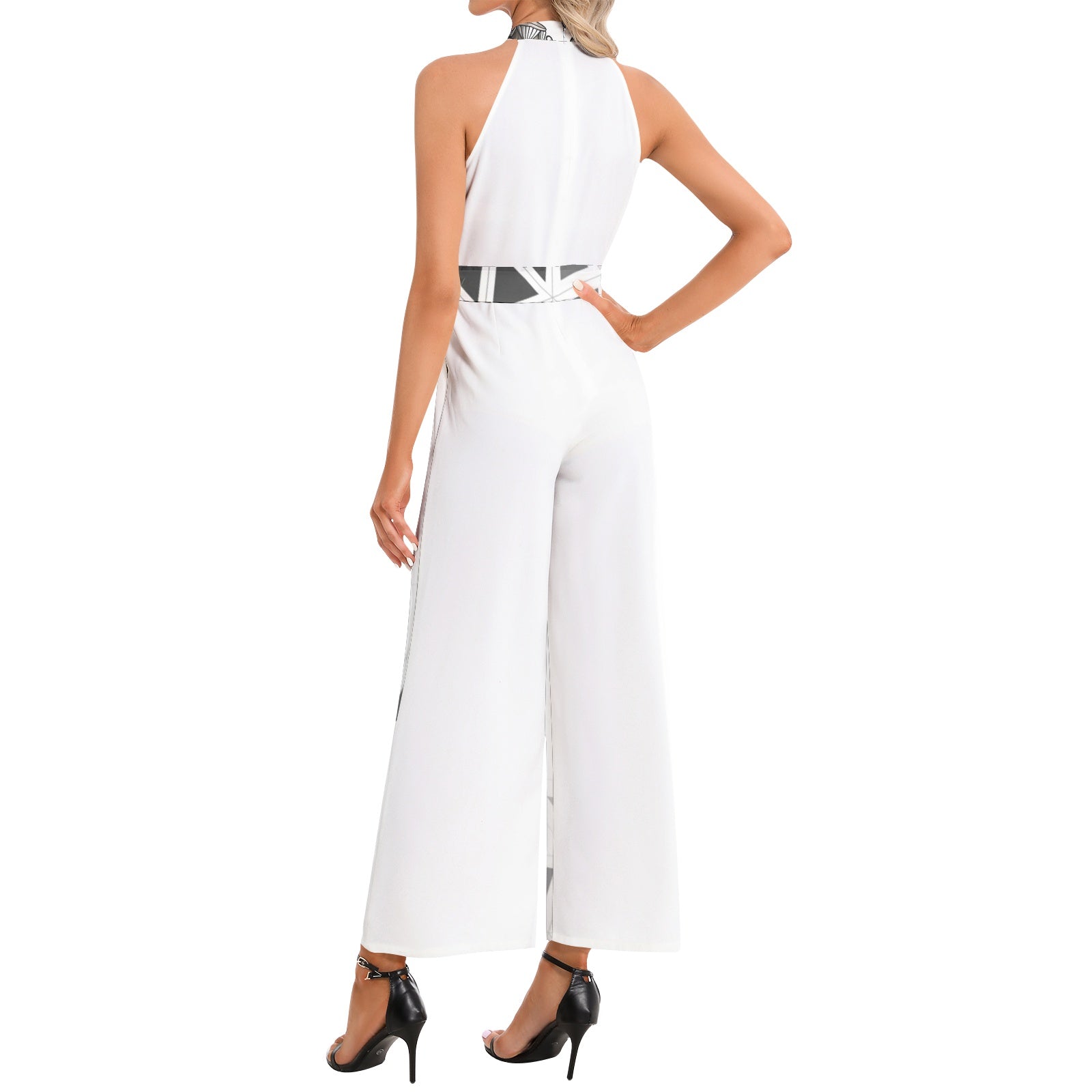 Sleeveless, Long length, Halter neck, High waist, Two inseam pockets, Belted jumpsuit